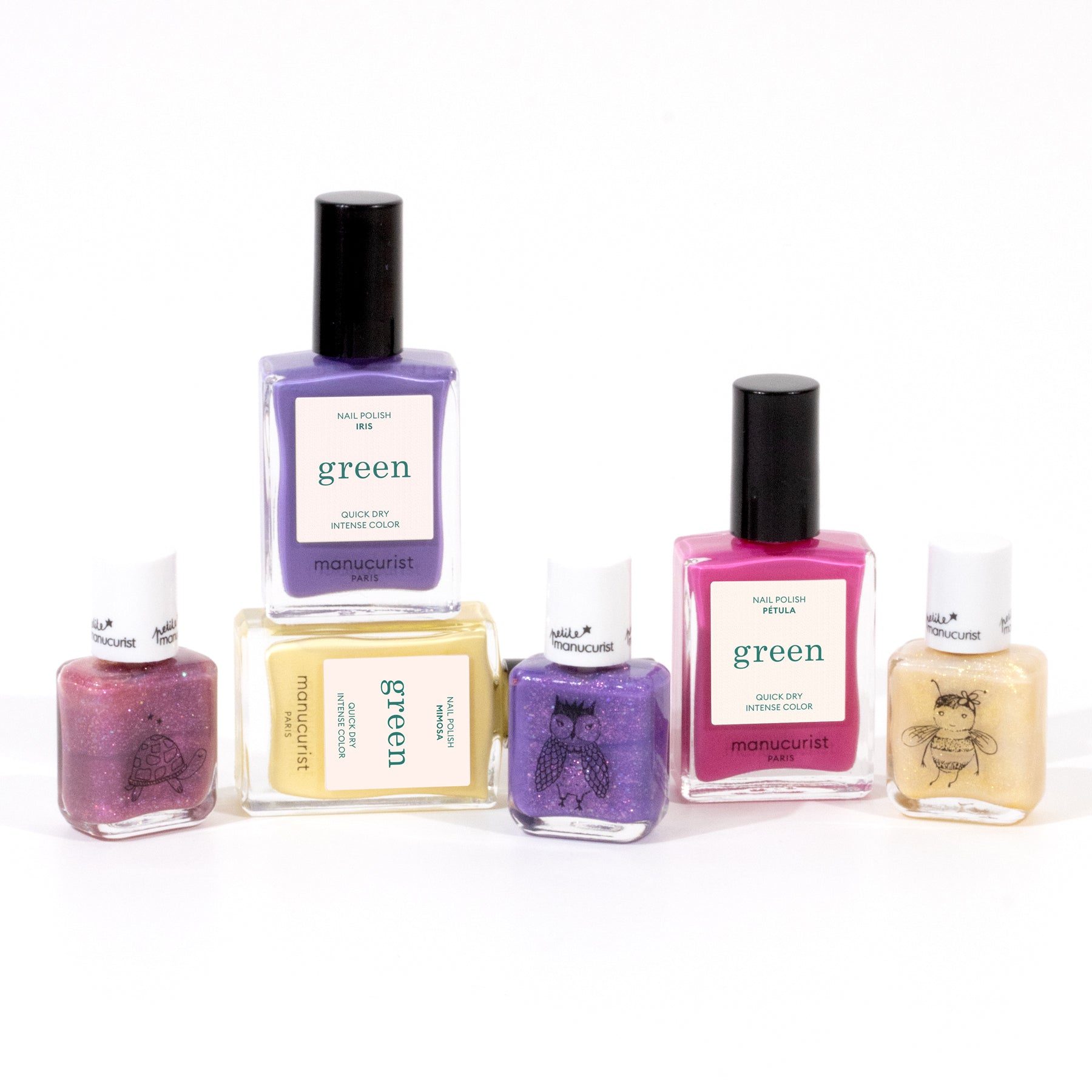 A set of Green polish and water-based petite Manucurist shades, perfectly paired for a moment to share